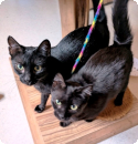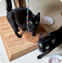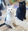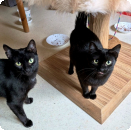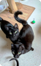 Minnie, ca. 2 Jahre, Scottish Fold Mix Katze (schwarz) und ihr Söhnchen Klausi, ca. 5 Monate alt.